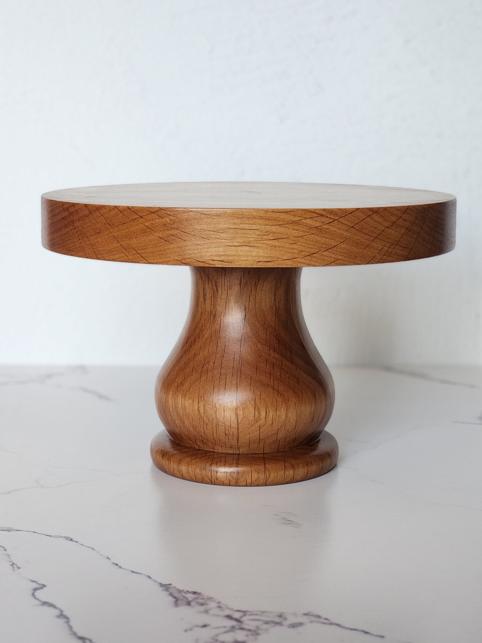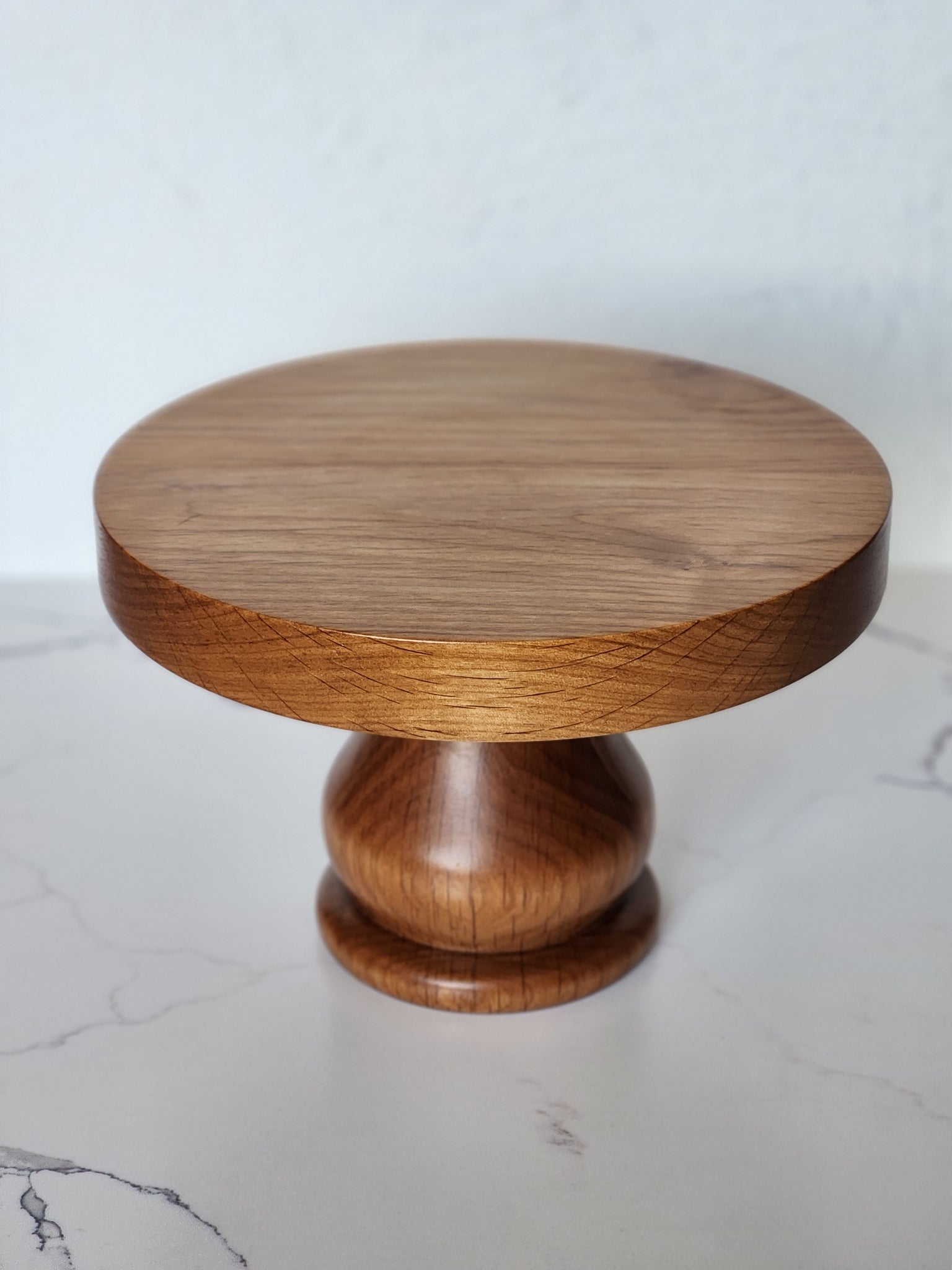 Sturdy and solid alder wood cake stand. 12 inches across and 8 inches tall.